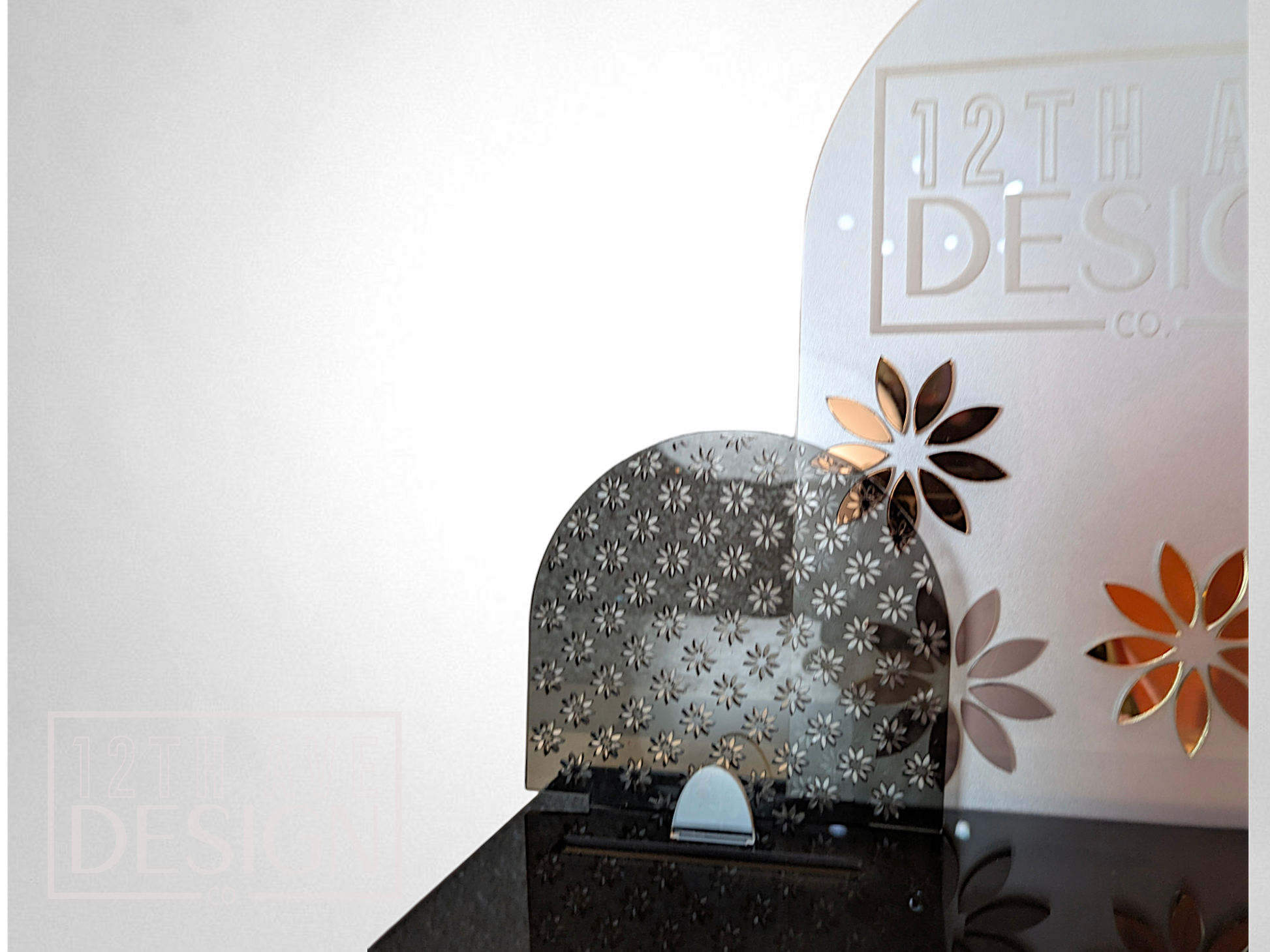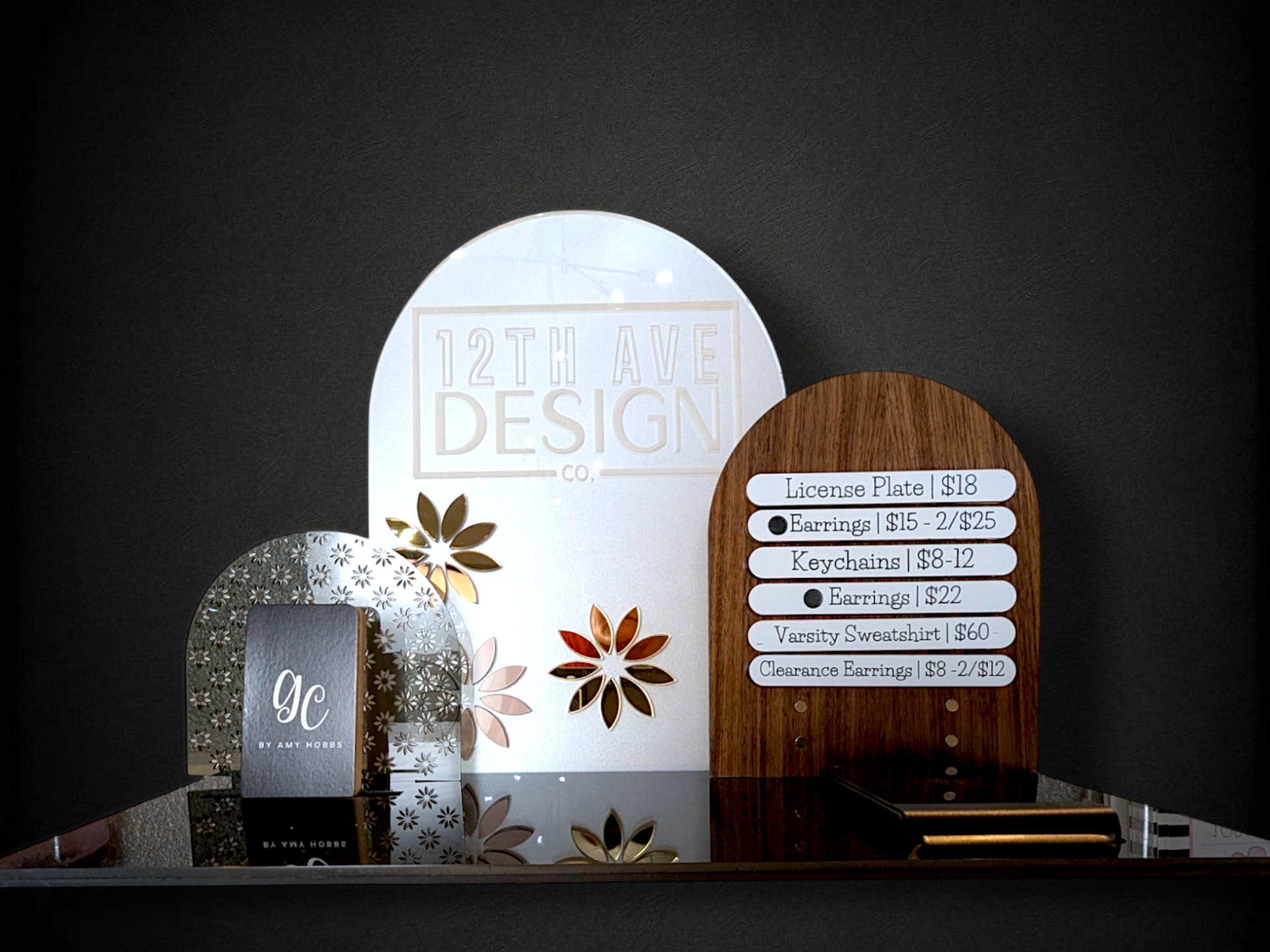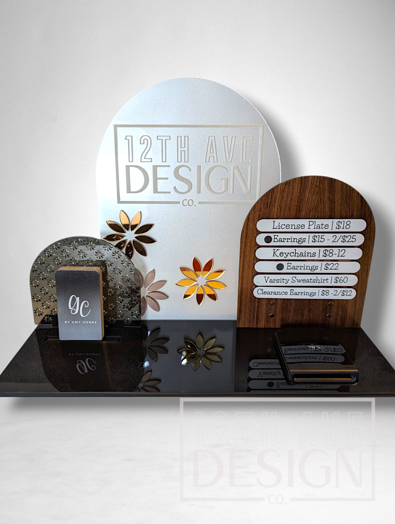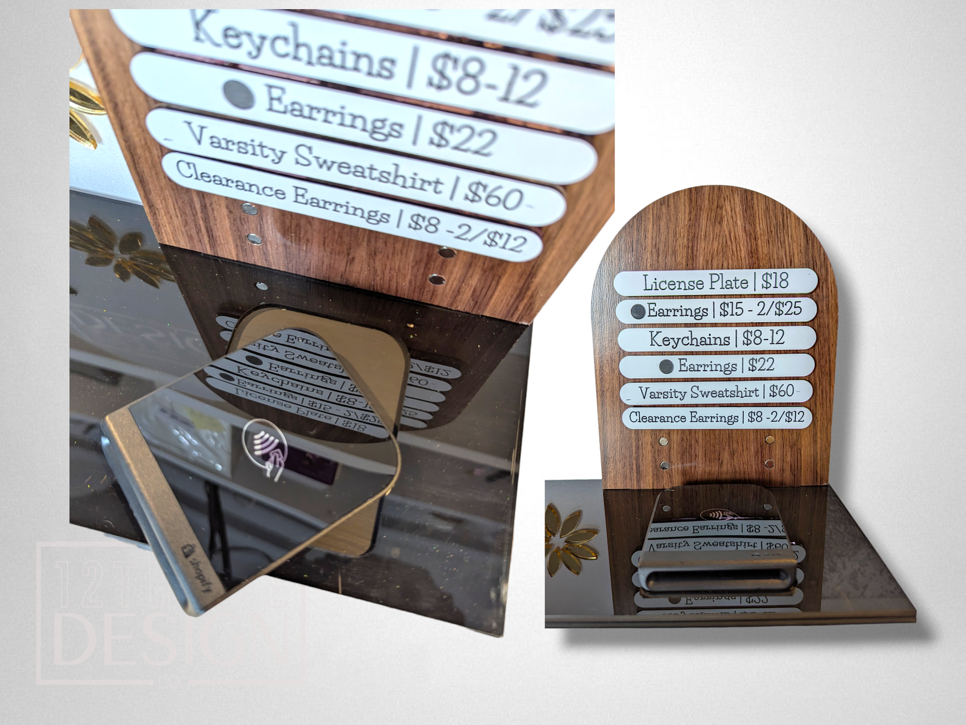 Triple arch magnetic interchangeable pricing sign with business card holder and square reader holder is the perfect display for retail or market display!