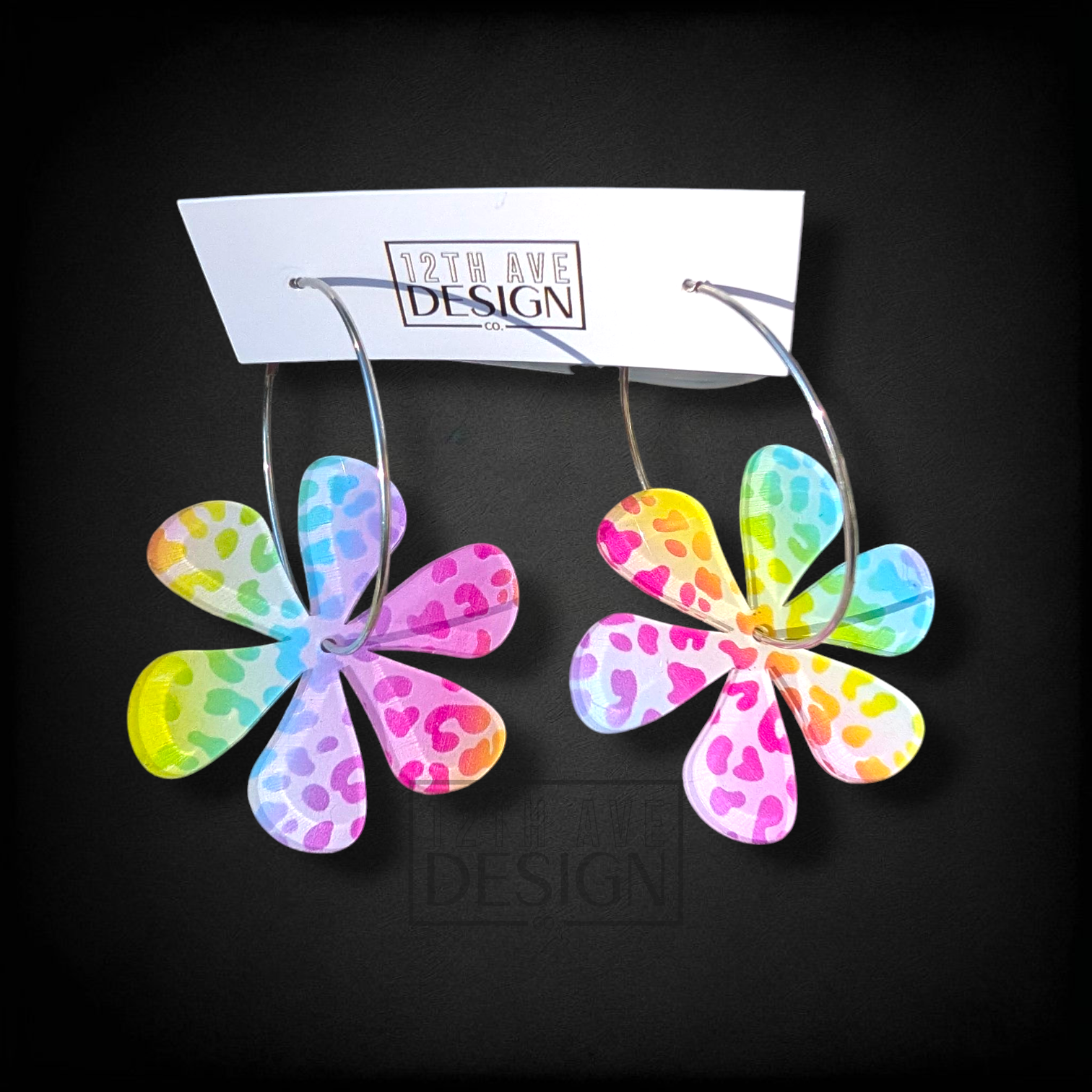 Sometimes, less is more. These simple acrylic flowers seem to float in the air. Suspended from the center on stainless steel hoop earrings. Choose from silver or gold-plated hoops.