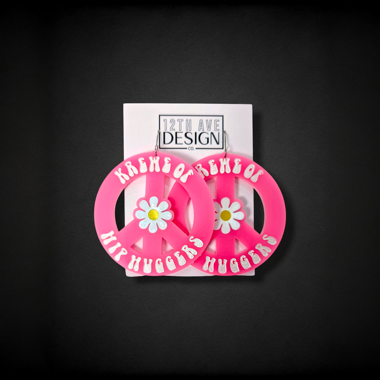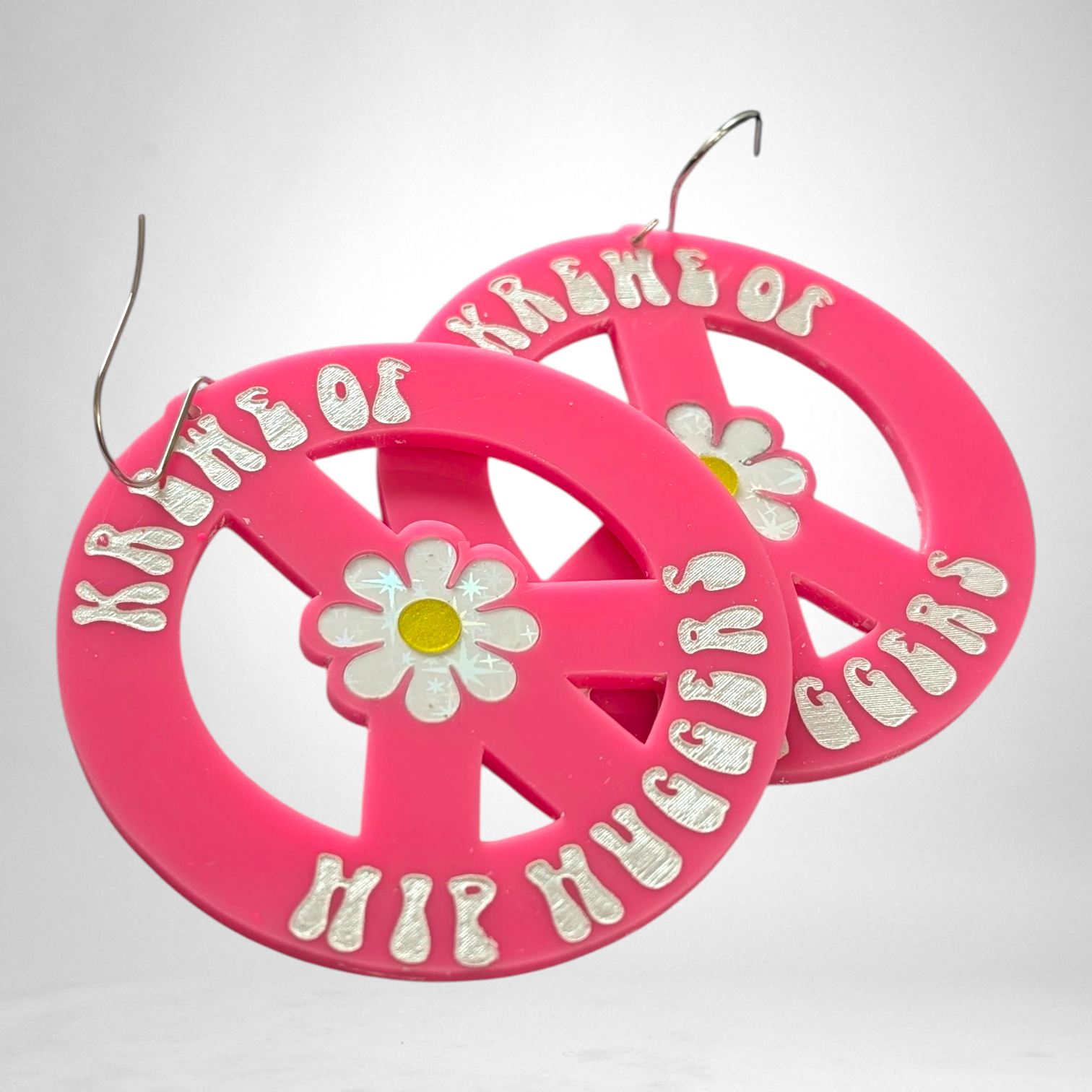 Lightweight acrylic in a classic hot pink is engraved with Krewe of Hip Huggers then hand-painted with a pearly finish. The white and yellow daisy is cut to fit perfectly flush so the flower is visible from both sides of the earrings.