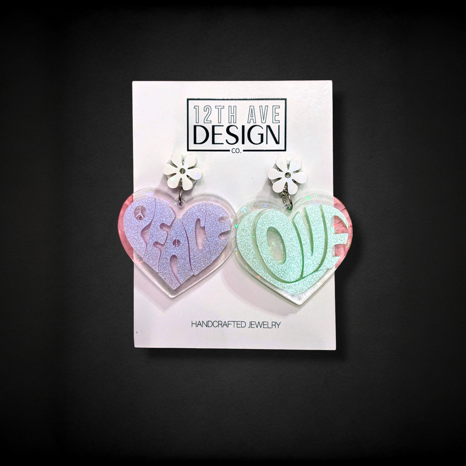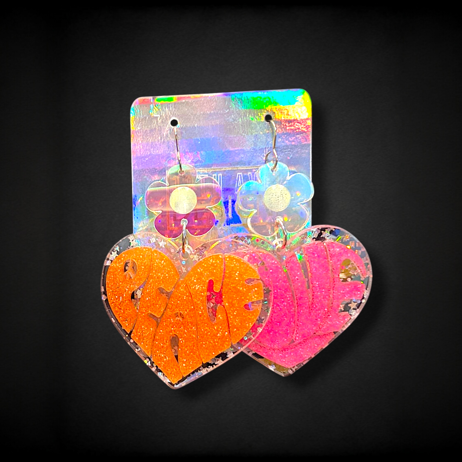 Heart shaped earrings with groovy, molded lettering in your favorite colors. Heart shape will be made with a transparent acrylic that best matches your color choices, and topped with a coordinating daisy accent.