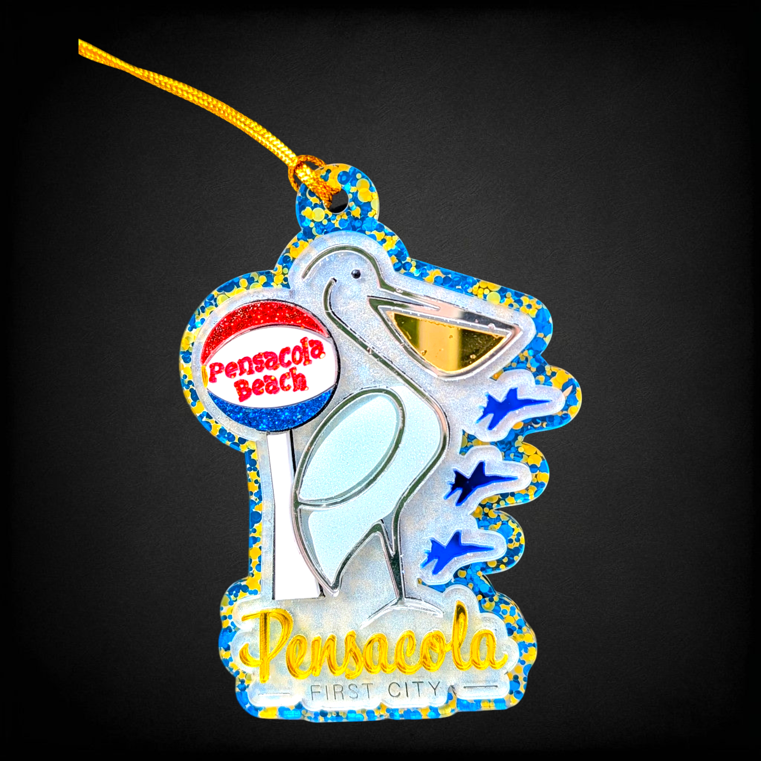 Pensacola's cutest ornament features carefully hand-painted details on 3D layers of laser cut materials.