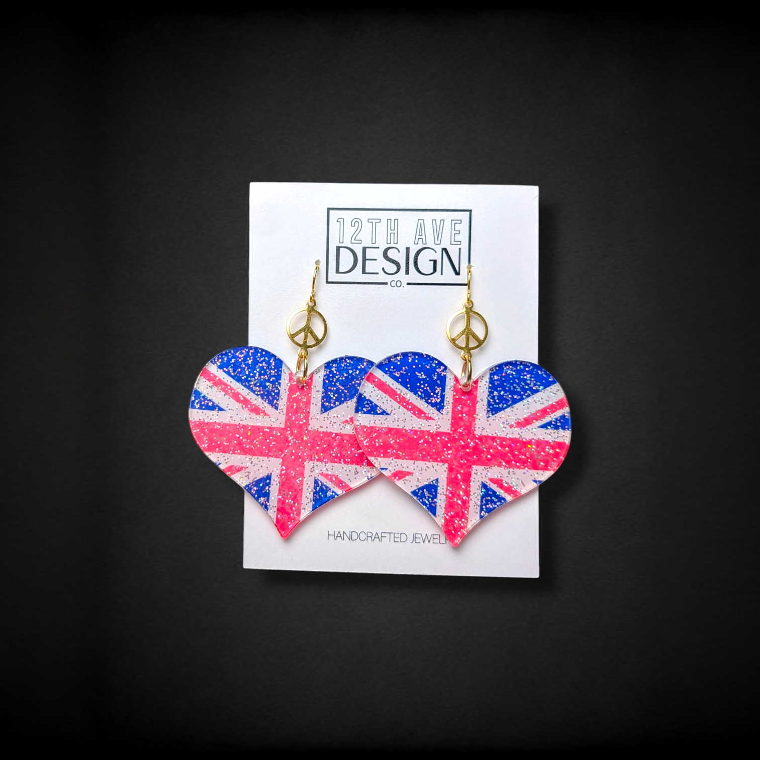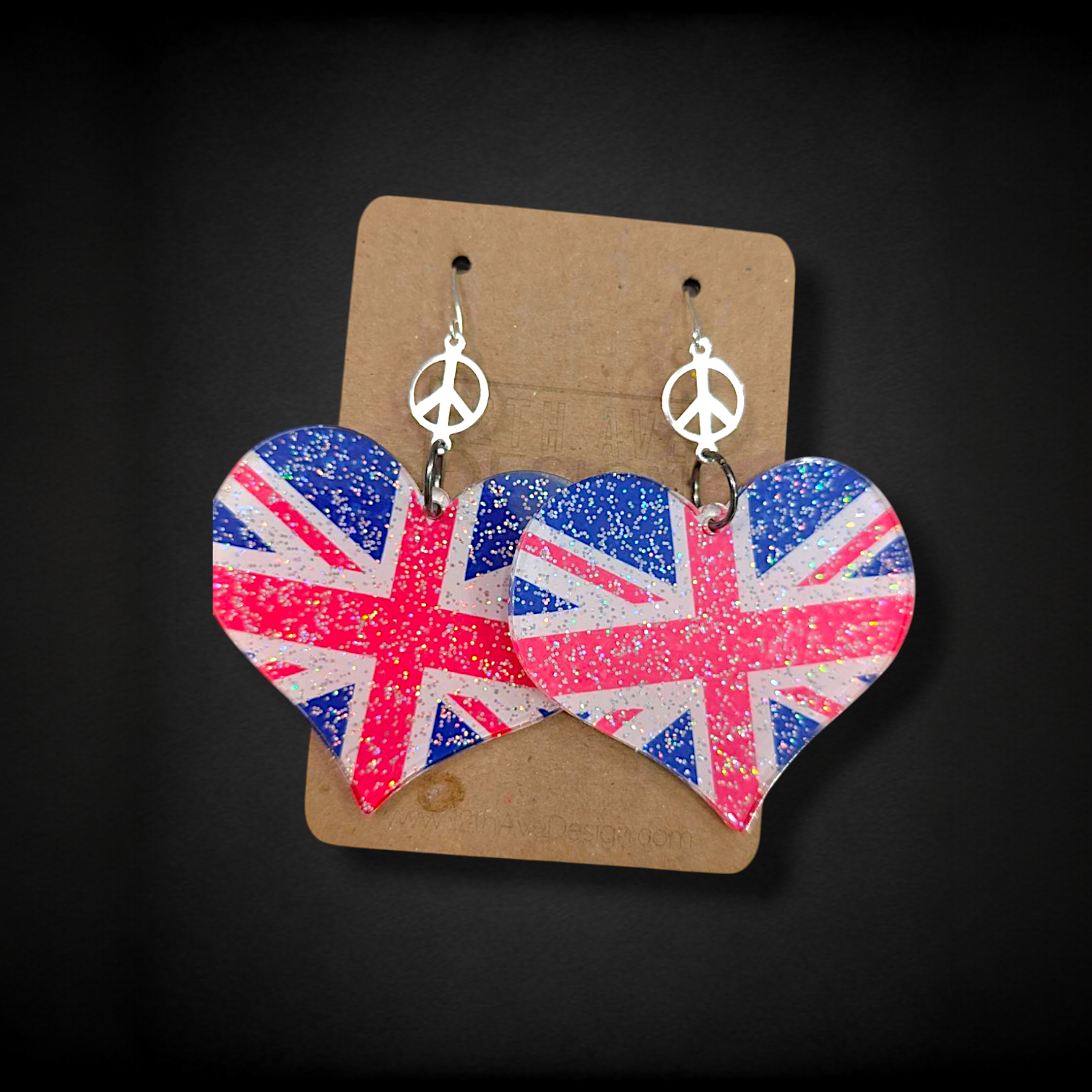 Heart-shaped Union Jack design in royal blue & hot pink. Topped with gold or silver metal peace signs and matching mini-hooks in surgical stainless steel.